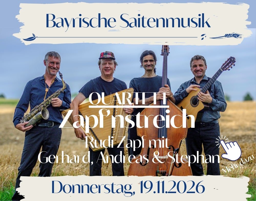Sie entzünden ein weltmusikalisches Feuerwerk mit allen nur denkbaren Klangfarben aus einem Spezial-Hackbrett, Saxophon, Klarinette, Querflöte, Gitarre, Kontrabass und Vibrandoneon. Rudi Zapf, Gerhard Wagner, Andreas Seifinger und Stephan Lanius verknüpfen wie selbstverständlich alpine Melodien mit temperamentvollen Latin-Rhythmen, Balkan-Beats, Walzer-Takte mit flirrenden Flamenco-Arabesken oder Klezmer-Klänge mit swingenden schier waghalsigen Jazz-Improvisationen. Das Ergebnis ist Weltmusik - temporeich, virtuos, mal locker lässig, aber stets geschmackvoll, überraschend und hochmusikalisch. Immer für eine Überraschung gut ist. Die vier Vollblut-Musiker entstauben alte Melodien und erwecken sie zu neuem Leben, hüllen sie in einen Mantel voller farbiger Harmonien und tränken sie in pulsierende Rhythmen